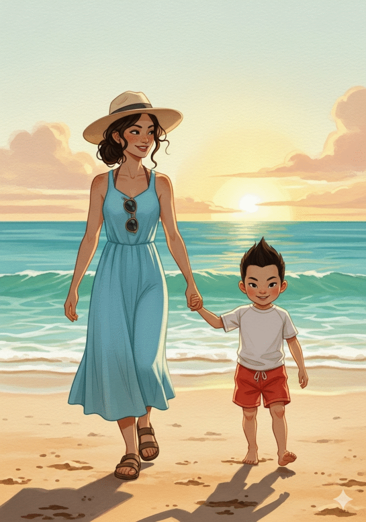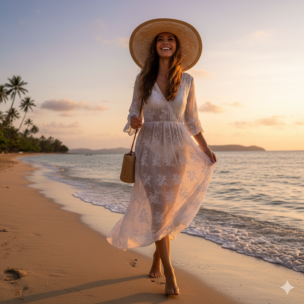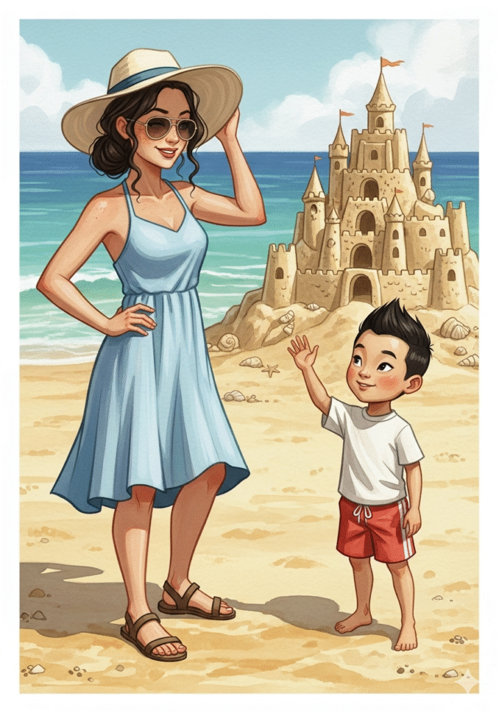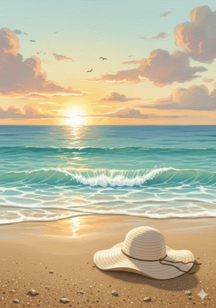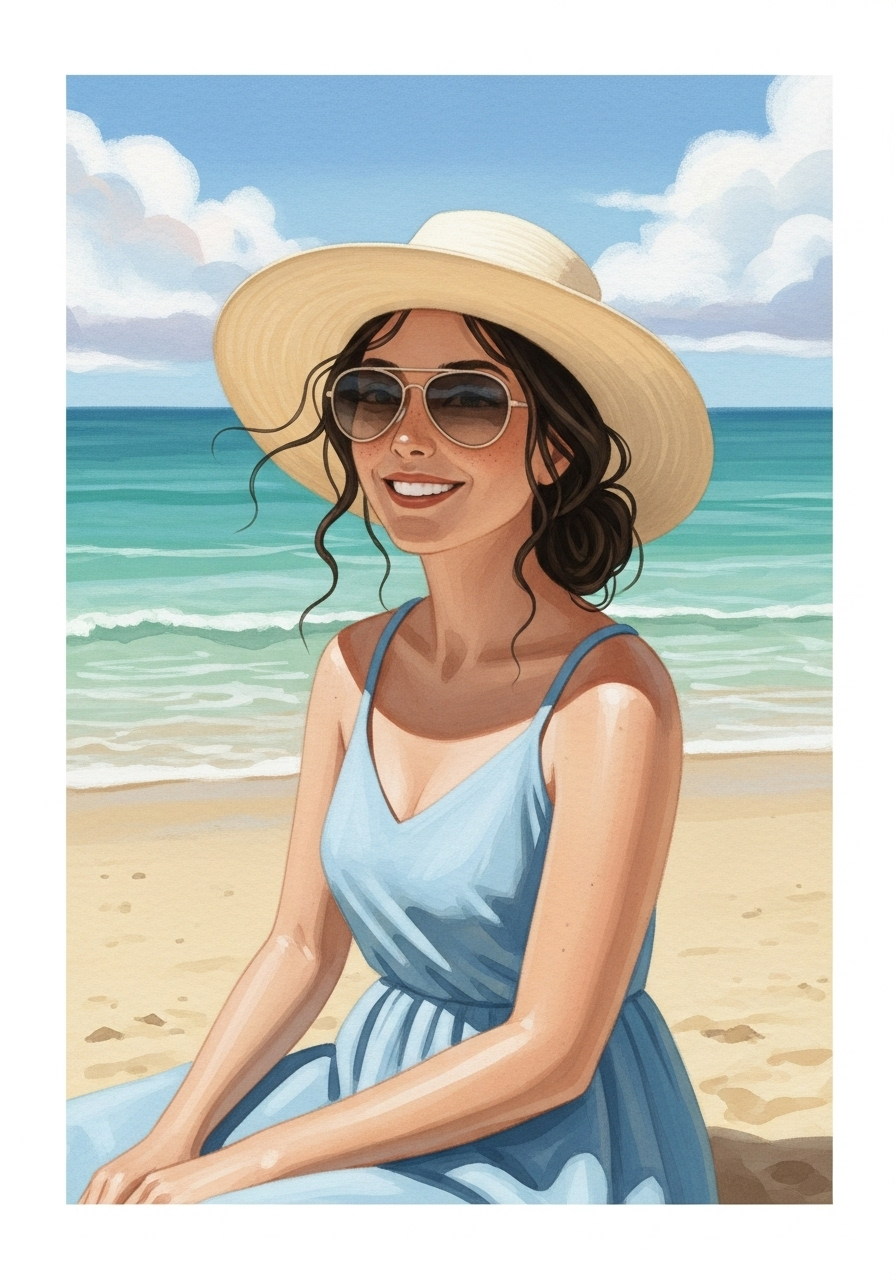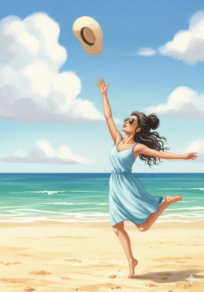 Em um dia ensolarado na praia, uma mulher chamada Liana relaxava na areia. O sol brilhava forte, mas Liana tinha um chapéu de sol especial que a mantinha fresca e feliz.