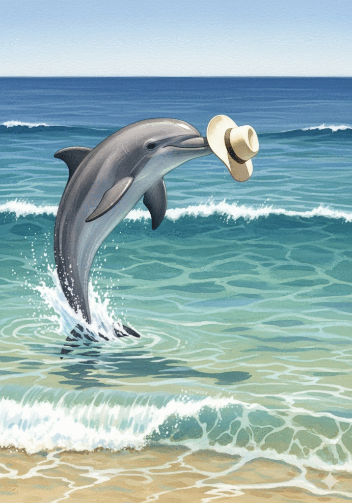 O chapéu voou sobre o oceano, e um golfinho brincalhão o viu. O golfinho saltou para fora da água e deu um toque no chapéu com o nariz, mandando-o de volta para a praia.