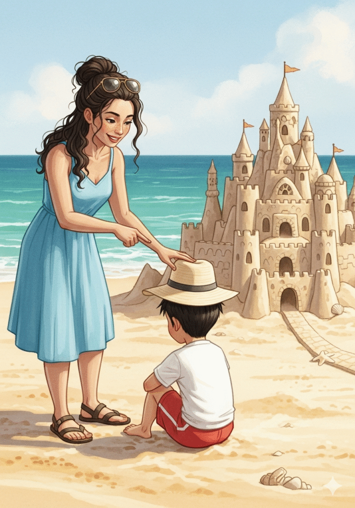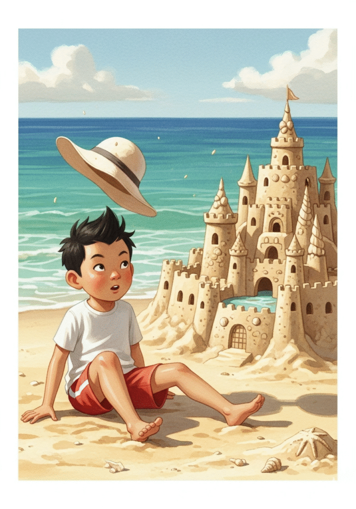 O chapéu pousou suavemente na cabeça de um menino que estava construindo um castelo de areia. O menino riu e olhou para cima, surpreso.
